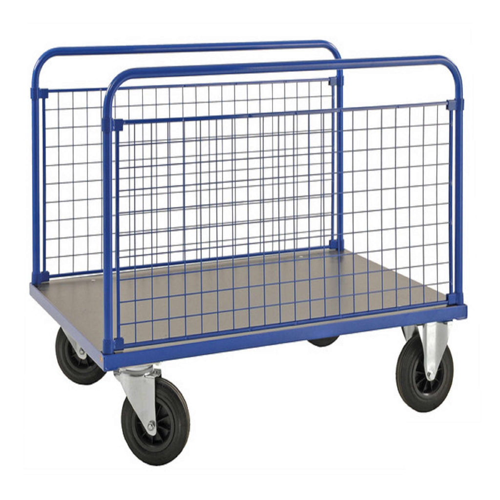 Serie di carrelli a piattaforma con rete e sponda all’estremità. I carrelli sono disponibili con 1-4 sponde. Utilizzo intelligente per un’ampia gamma di applicazioni sia nell’industria che per esempio per contenere palloni per il calcio o il basket.