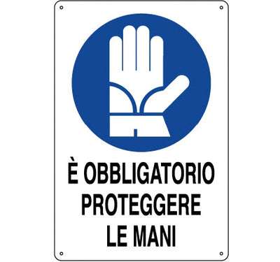 Cartello ' E' OBBLIGATORIO PROTEGGERE LE MANI' in alluminio piano verniciato. Dimensioni 200X300mm